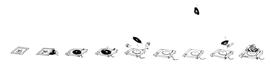 The drawing showing the metamorphosis of an old record has been made by Marco de Francesco.